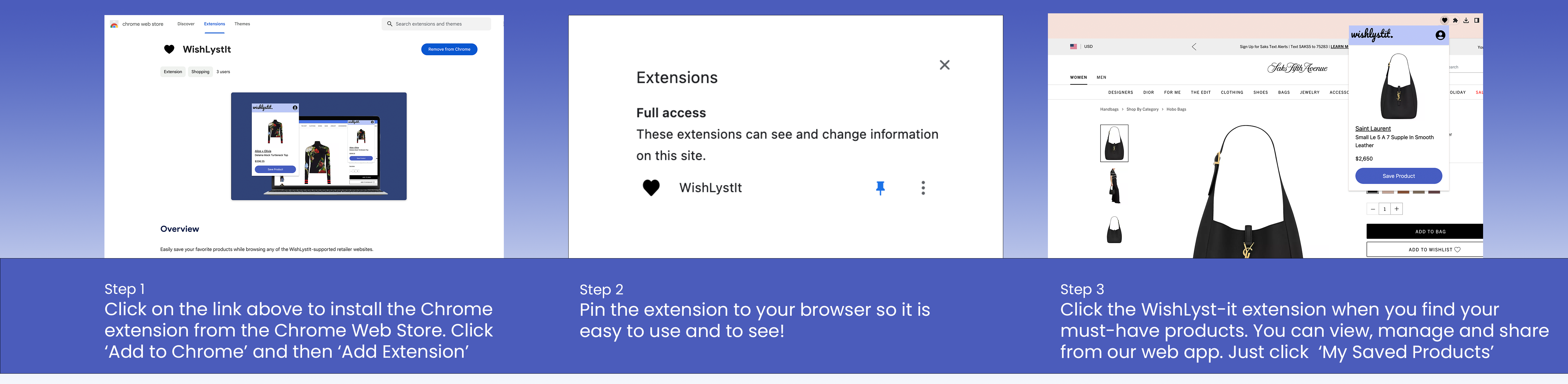 Our Chrome extension allows you to easily save your favorite products while browsing any of the WishLyst-it-supported retailer websites.